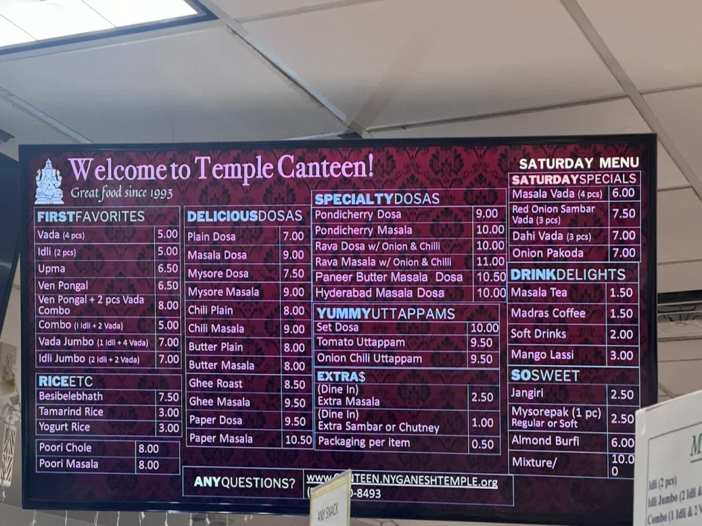 The Hindu Temple Canteen, part of the Hindu Temple Society of North America (Ganesh Temple) in Flushing, Queens, is a beloved South Indian vegetarian eatery tucked into the basement of the temple’s community center.  Established in 1993 primarily to prepare naivedyam (food offerings) in line with Hindu ritual traditions, the canteen has grown into a gathering place for devotees and food lovers alike. Simple and unadorned in ambiance—plain communal tables, functional décor—the canteen’s charm lies in its food: authentic South Indian fare like dosas, idlis, vadas, uttapams, sambar, and coconut chutney. Generous portions, modest prices, and warm service make it a favorite among regulars and visitors. Open every day from morning till evening, it serves both indoor dining and takeout (and modern delivery options), offering over a hundred vegetarian items and snacks year-round